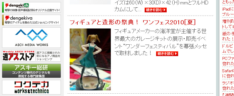その後、アスキーメディアワークス様も取材に来られ、なんとWF翌日の月曜には「週アスweb」にてバーーーンと本楽さんフィギュアがTOPに紹介されているという大栄誉!